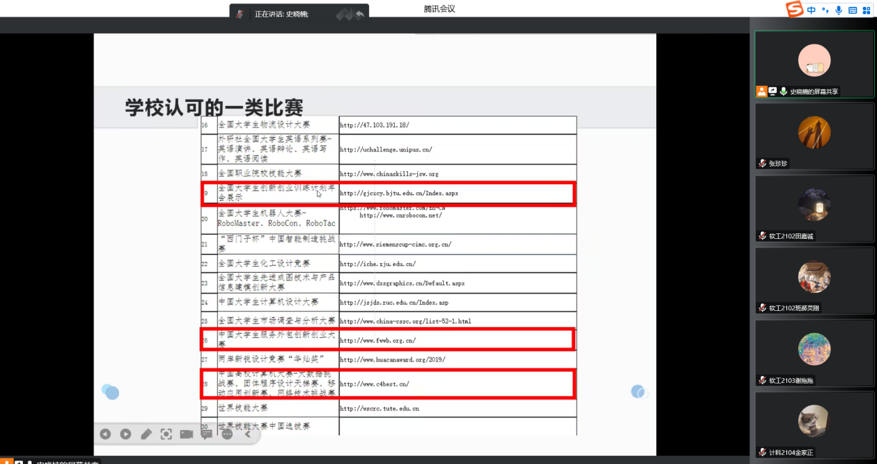 会上,史老师从学科竞赛的种类、历年获奖情况、竞赛对考研与就业的促进作用等三方面进行全面解读和分析,重点讲解了中国老员工服务外包创新创业大赛、蓝桥杯全国软件和信息技术专业人才大赛、中国高校计算机大赛等计算机类重点赛事相关情况,她鼓励同学们提前了解各类赛事特点,结合公司专业设置情况,充分利用支持政策和优势资源积极参加各类创新创业活动,为将来的就业、考研打好基础。