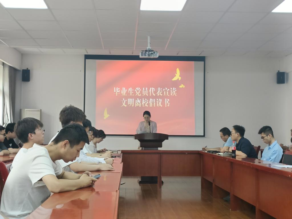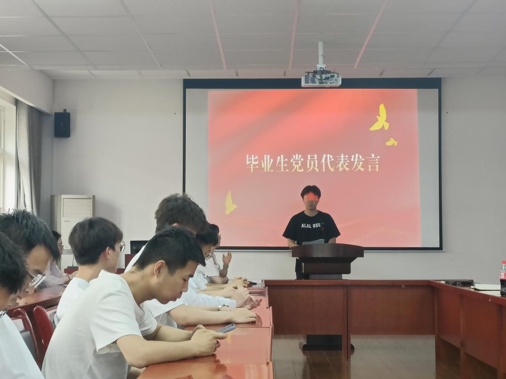 在庄严的国际歌之后,2019级员工党支部书记于海泉带领与会全体党员面对党旗重温入党誓词,并为新转正的党员佩戴了党徽;毕业生生党员代表陆长辉进行了发言;毕业生党员代表王曼琳宣读了《文明离校倡议书》;2020级员工党支部书记宋永强介绍了毕业生党员组织关系转接的政策流程及相关注意事项。