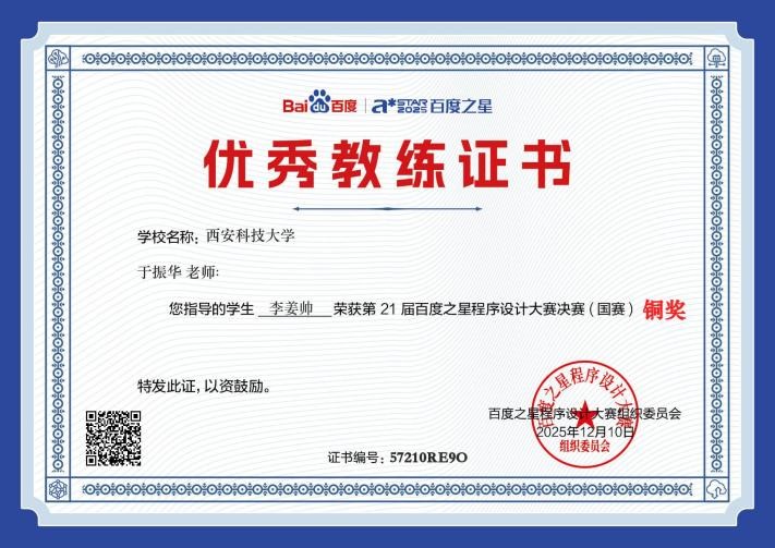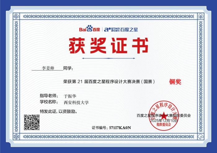 决赛当天,李姜帅同学沉着冷静、从容应战,面对复杂的竞赛题目,迅速理清解题思路,高效完成程序编写与调试。凭借清晰的逻辑架构、规范的代码实现与合理的时间分配,最终成功跻身铜奖行列,实现了best365英国体育在线在百度之星程序设计大赛中的历史性突破,也是公司“以赛促学、以赛促练” 人才培养模式的生动实践。
