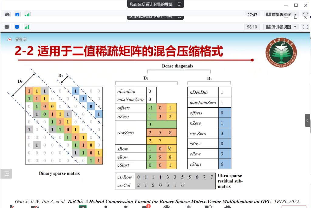 计教授主要介绍了基于GPU的稀疏矩阵向量乘性能优化方法,主要内容包括基于数学形态学的稀疏矩阵划分与加速优化、二值稀疏矩阵的加速优化、基于机器学习的稀疏矩阵压缩编码格式选择和配置选择等。
