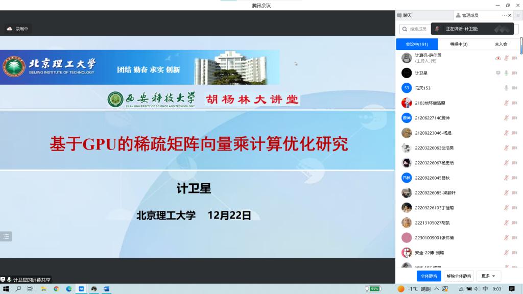 12月22日,计算机公司承办的“胡杨林大讲堂”以线上腾讯会议的方式进行,公司邀请北京理工大学计卫星教授以“基于GPU的稀疏矩阵向量乘计算优化研究”为主题为公司研究生带来了一场精彩的学术讲座。报告由公司副经理马天教授主持,全校300余名研究生及教师聆听了报告。
